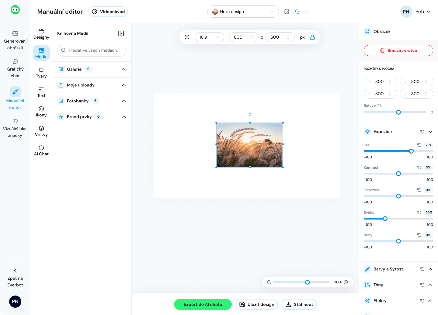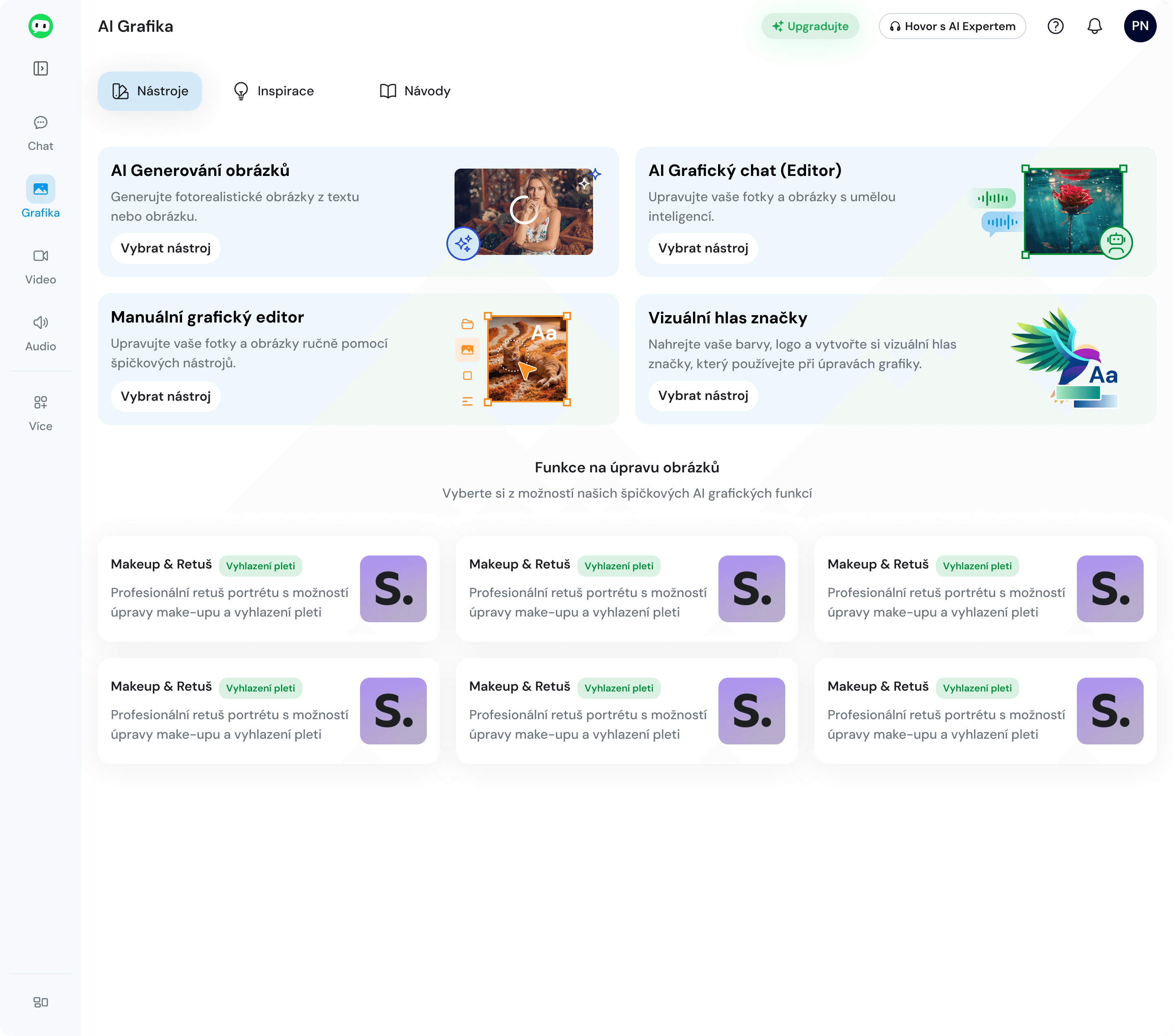 Dashboard funguje ako rozcestník na 4 hlavné podtooly – používateľ si hneď vyberie, čo chce robiť (generovanie, manuálny editor, grafický chat, brand).